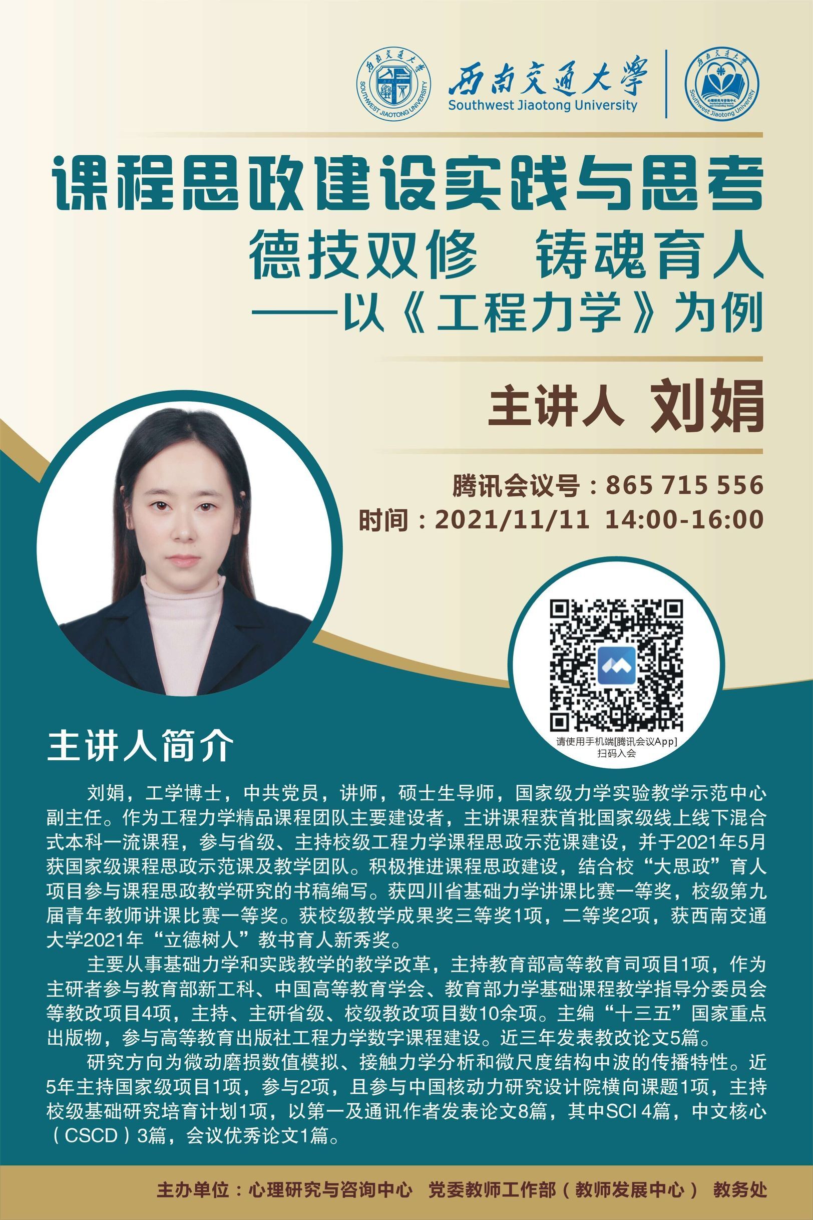 刘娟,工学博士,中共党员,讲师,硕士生导师,国家级力学实验教学示范中心副主任。作为工程力学精品课程团队主要建设者,主讲课程获首批国家级线上线下混合式本科一流课程,参与省级、主持校级工程力学课程思政示范课建设,并于2021年5月获国家级课程思政示范课及教学团队。积极推进课程思政建设,结合校“大思政”育人项目参与课程思政教学研究的书稿编写。获四川省基础力学讲课比赛一等奖,校级第九届青年教师讲课比赛一等奖。获校级教学成果奖三等奖1项,二等奖2项,获麻豆传媒-麻豆官网